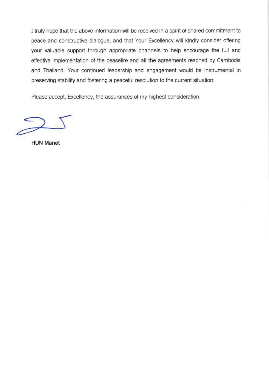 លិខិត ផ្ញើជូន ឯកឧត្តម António Guterres អគ្គលេខាធិការអង្គការសហប្រជាជាតិ ពាក់ព័ន្ធនឹងការវិវឌ្ឍនៃស្ថានការណ៍ព្រំដែន កម្ពុជា-ថៃ។